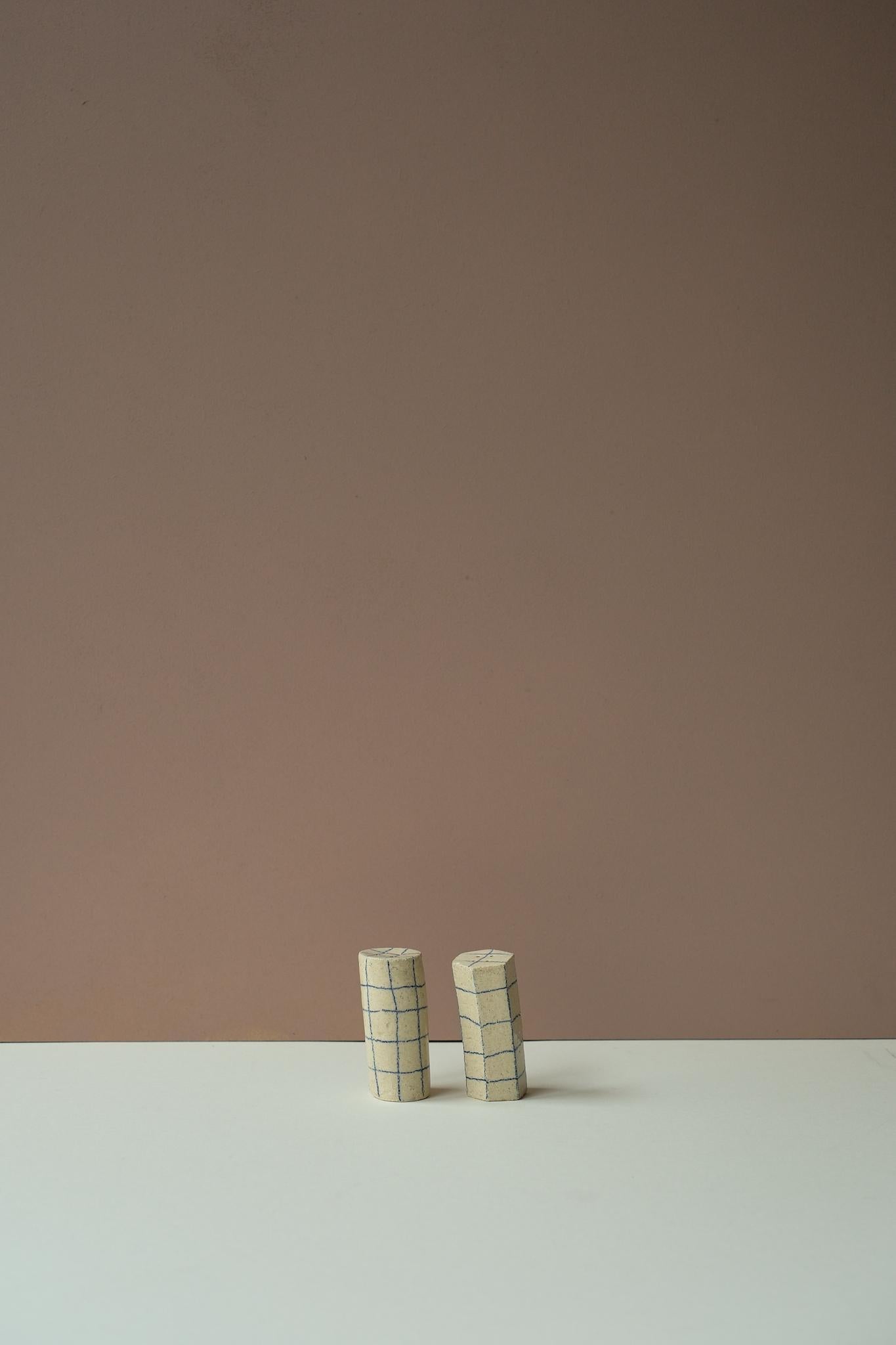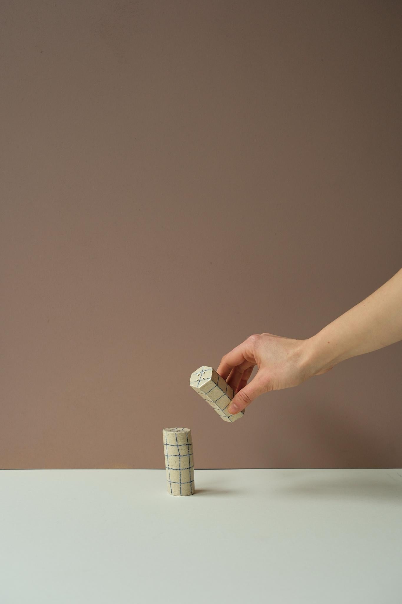 Delightfully wonky, this pair of shakers come with a matching tray with indents for each one and feature a hand-drawn blue grid design. A great addition for any dining table.